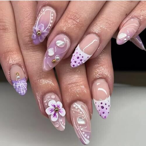 • Transform your nails with a purple gradient finish and subtle 3D flowers for a chic, eye‑catching manicure.