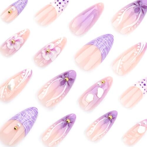 Transform your nails with a purple gradient finish and subtle 3D flowers for a chic manicure. Full cover, reusable press-on nails with easy adhesive, 24 pieces, medium length—designed for DIY wear at home or on the go.
