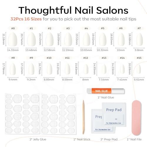 32 fake nails in 16 sizes, nail glue, 2 sheets jelly adhesive tabs, double-sided nail file, cuticle stick, alcohol pad