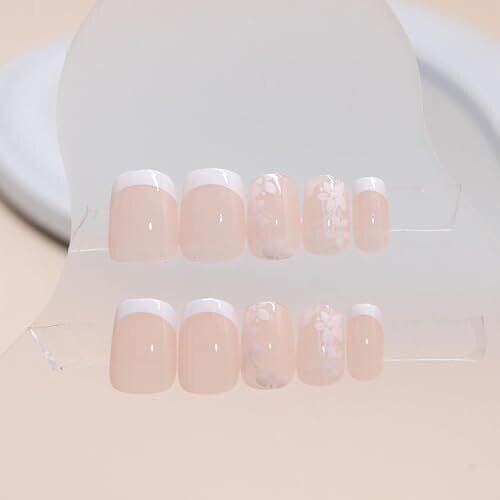 Chic, fast press-on nails by Mumoo Bear. Short square nails with white flower design for spring/summer. Glue-on application delivers salon-quality results at home. Includes 24 nails in 12 sizes for a comfortable, nude glossy finish.