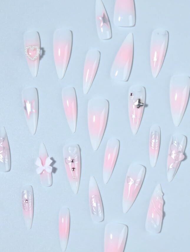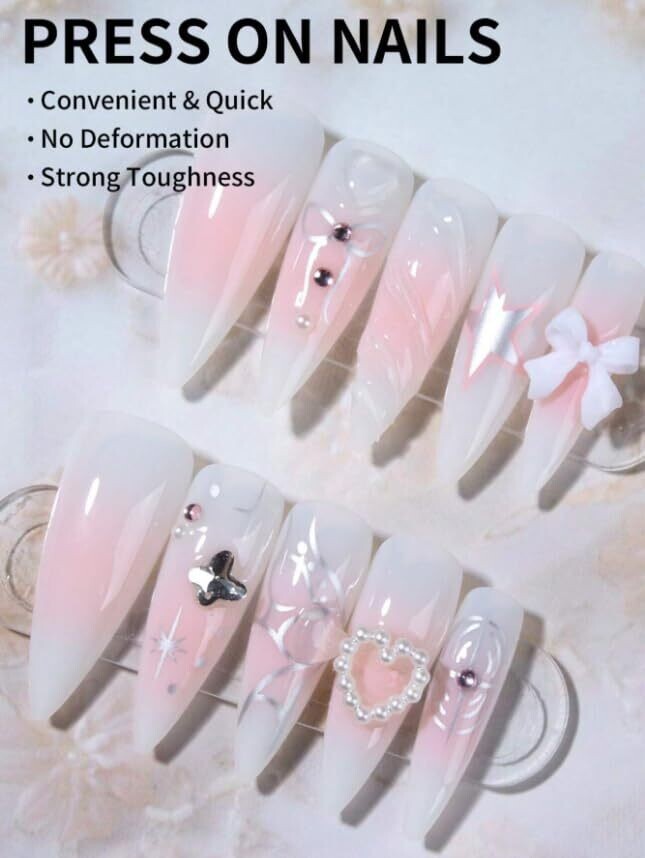 Select tips embellished with sparkling rhinestones and 3D bow decorations for an eye-catching finish.