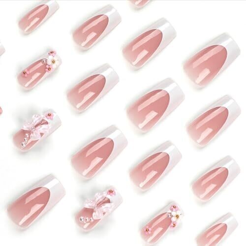 24-pcs French Pink Bow Press-On Nails, Square, 3D Flower with Rhinestones, Full Cover Acrylic Nails