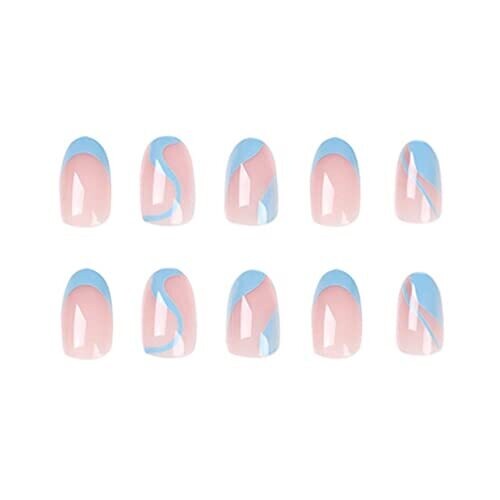 Rikview French tip press on nails offer a chic blue swirl design with almond-shaped medium-length tips for a salon-ready, long-lasting manicure you can apply at home. Comfortable wear with secure adhesion and versatile style for any occasion.