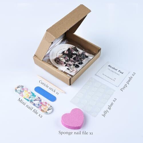 10 nail tips; mini nail file x2; heart shaped sponge nail file x1; 24 jelly glue sheets; prep pads x2; cuticle stick x1.