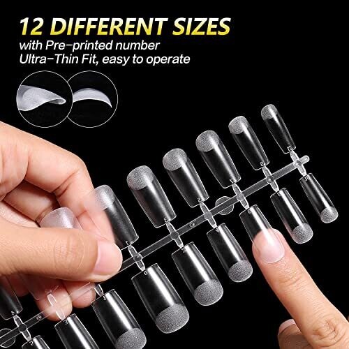 Marketing-focused full-cover nail tips designed for salon-quality extensions and stunning DIY nail art at home. Includes 432 tips in 10 sizes with numbered 0–9 for quick fits, a pre-buff frosted surface for faster application, and comfortable, flexible use.