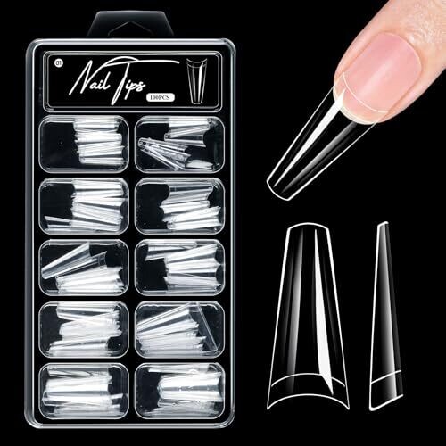 Versatile fake nail tips in coffin, square, and stiletto shapes with a clear acrylic base for seamless nail art. Includes 10 sizes and 100 pieces for a precise fit, lightweight ABS for comfortable wear and easy trim, apply, and color.