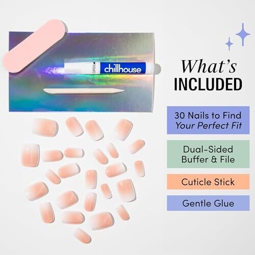 Chillhouse - Chill Tips, Press on Nails Kit - Born Day (Square) - 30 Nail Shapes & Sizes - Up to 2 Weeks of Wear - Customizable Fit - Reusable - Latina Founded & Women Owned - Beauty & Self Care. Includes 30 Born Day (Square) nail shapes & sizes, dual-sided buffer & file, cuticle stick, and Gentle nail glue. Nail tips are compatible with nail glue and designed for removable reuse. Wear duration stated as up to 2 weeks with proper application. Brand information