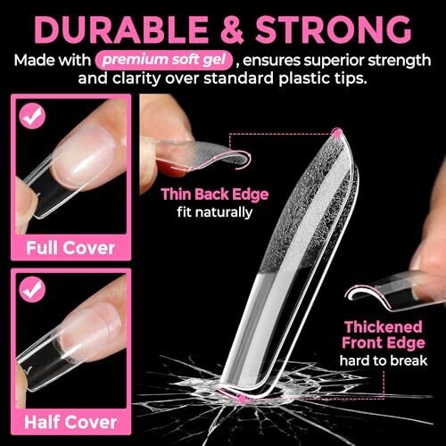 • Clear, glossy tips that work beautifully with nail polish, dip powders, or acrylics for customizable nail art.
