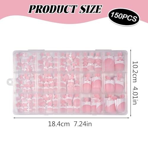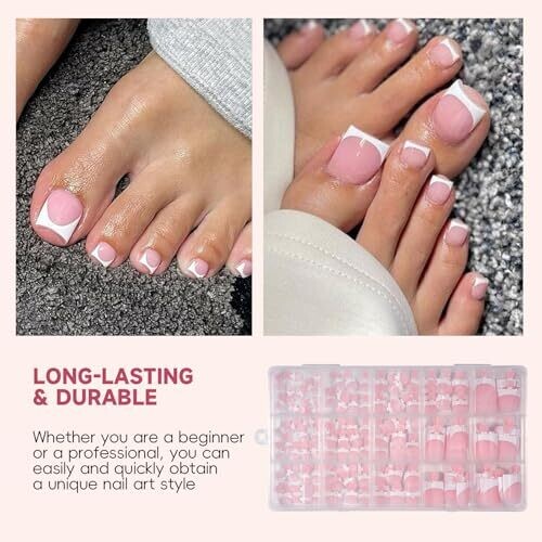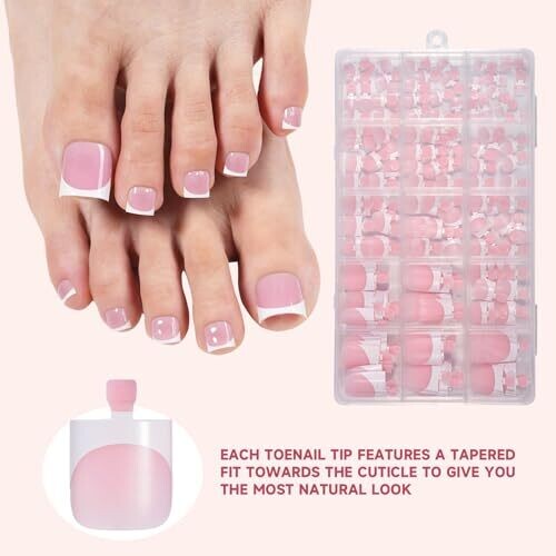Achieve salon-quality pedicure quickly with pre-designed nail tips that prime and base coat for fast, easy application. Includes 150 pieces in 15 sizes for a precise fit, natural taper, durable wear, and a chic French finish for open-toe looks.