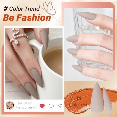 • Elevate your manicure with a chic, runway-ready matte Khaki look in long stiletto shape.