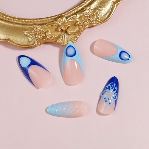 • Elevate your at-home manicure with 24-piece reusable acrylic press-on nails in a mysterious blue featuring 3D butterfly wings for a dramatic, salon-worthy look.