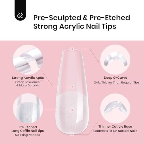 - Clear full-cover coffin nails offering thickness, strength, and a long-lasting finish