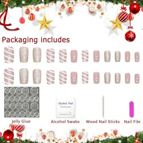 • Glamorous Folmywy 24 Pcs Glitter Christmas Fake Nails set designed for a festive, eye-catching manicure.