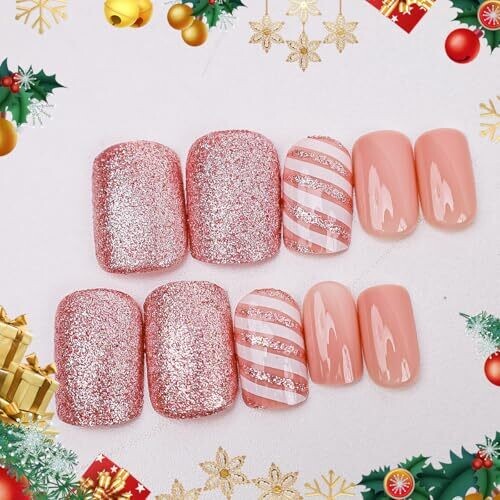 Glamorous Folmywy glitter Christmas nails set features 24 oval, full-cover tips with easy-stick-on application for salon-style results at home. Reusable with a durable glitter finish, they fit multiple nail sizes for secure, seasonal holiday wear.