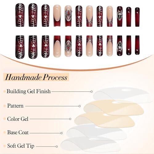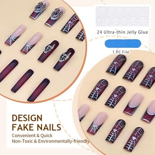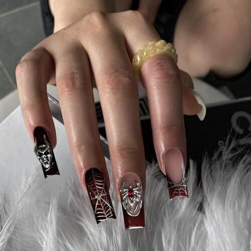 Glamrays 24-pack long square false nails create a bold Gothic black-red ombre look with chrome cobwebs and spider accents. Includes 24 nail ons in 12 sizes and glue for secure, at-home application. Non-toxic, odour-free and comfortable for daily wear.