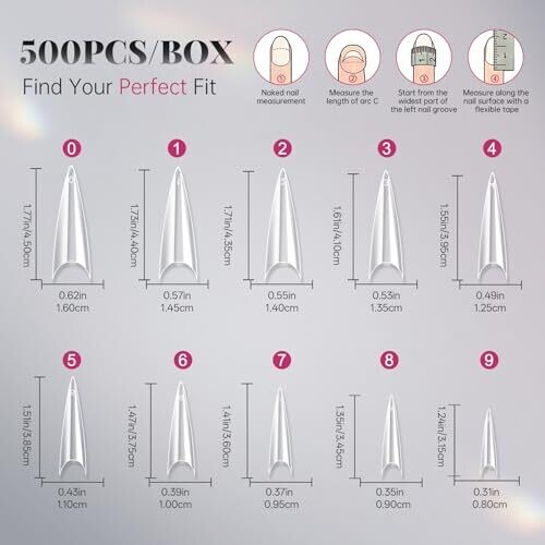 500 pieces in total; 10 sizes numbered 0–9; XL extra-long stiletto shape; half-cover nail tips.