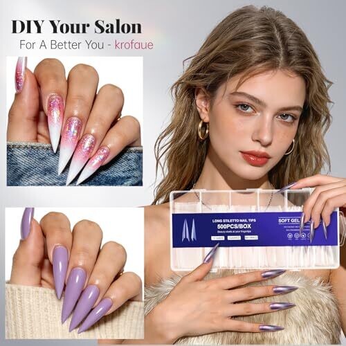 Premium Krofaue 500Pcs stiletto nails in extra long, clear half-cover tips for a bold look. Made from durable ABS, with 10 sizes for a precise fit. Easy to trim and dye, color lasts 1–3 weeks, bulk package for pros.