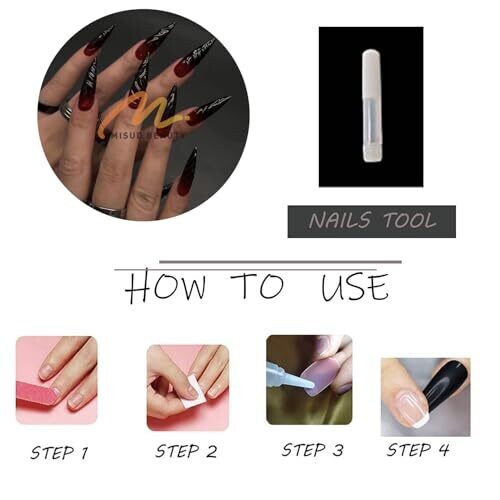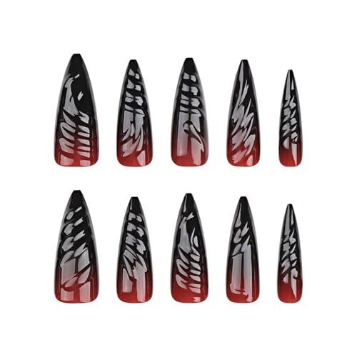 Misud Stilettos long glossy fake nails set for glue-on application. Gothic almond acrylic design with red and black gradient and subtle 3D accents. Includes 24 pieces for a dramatic, easy-to-wear statement manicure.