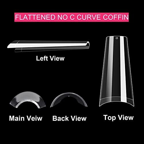 These 500 clear, no c-curve coffin nail tips come in 10 sizes with a sturdy box for easy storage. ABS construction provides strength and smooth, odor-free wear, ideal for professional salons or DIY nail art.