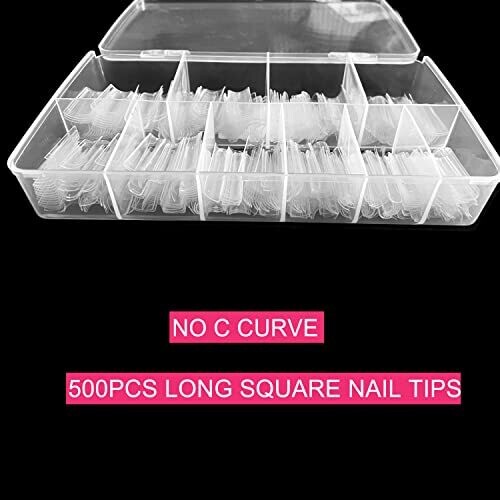 Swetidy Clear Acrylic Square Nail Tips come in 500 pieces with No C Curve for a long square, flattened half-cover design. Ten sizes fit most nails; includes durable box for organized storage and professional or DIY use.