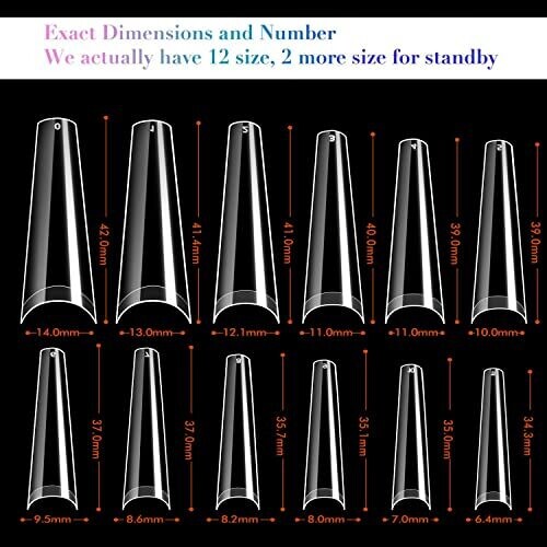 216 pieces; nail tips in coffin shape, long/extra-long variants; 12 sizes including 2 larger/smaller options for broad nail variation.