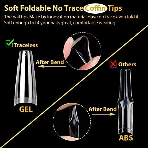 Achieve salon-worthy coffin gel nails at home with this easy, clear shape. Soft gel tips press, trim, and paint like real nails for durable, long-lasting wear—up to 3+ weeks—with 504 tips in 12 sizes for quick fit.