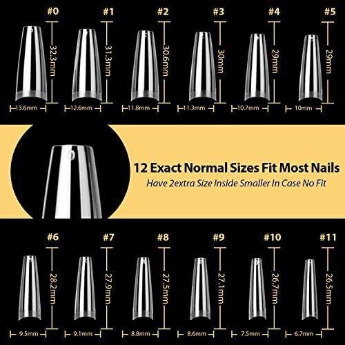 504 pieces; 12 sizes; tips are pre-numbered on the top. Soft gel material. Coffin/ballerina shape. Intended for nail extension and DIY home use. Lasts 21+ days with proper application. No odor; non-harmful to natural nails. Suitable for use with nail polish, dip powder, acrylic and acrylic powder. Includes long, clear coffin gel tips designed for smooth edges and easy adhesion.
