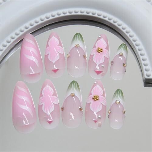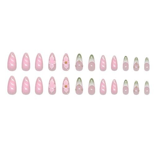 • Elegant Nails Floral Designs Almond Press On Nails Acrylic Manicure 24pcs