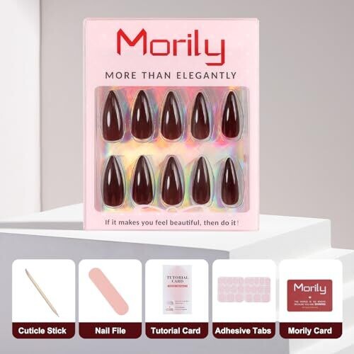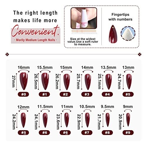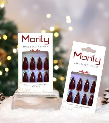 • Morily 24pcs Wine Red Press-On Nails Medium Stiletto Glossy Acrylic Full Cover Nails