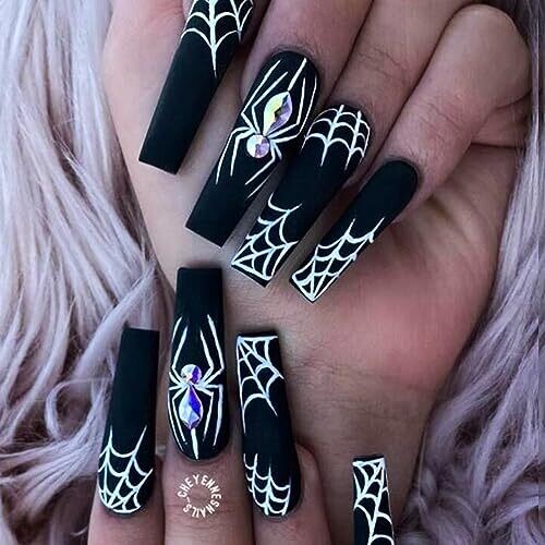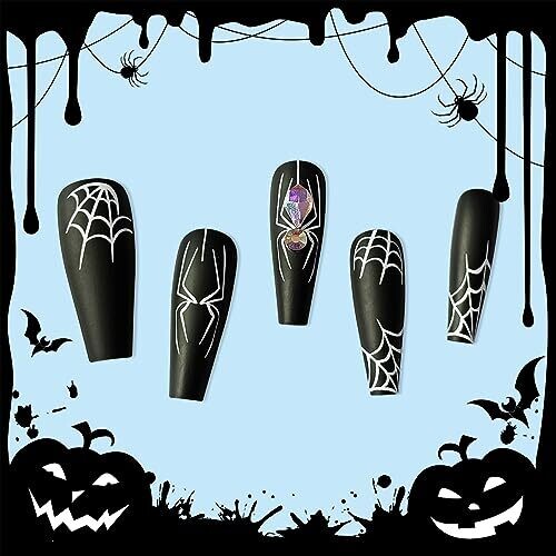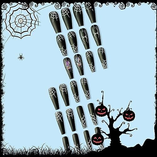 • Folmywy 24 pcs Halloween Press-On Nails Black Spider-Web Long Coffin Acrylic