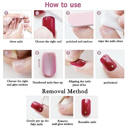 select the suitable nail piece, polish the nail bed, apply the provided glue, press the nail for 30 seconds to secure, and achieve a finished look in a few minutes.