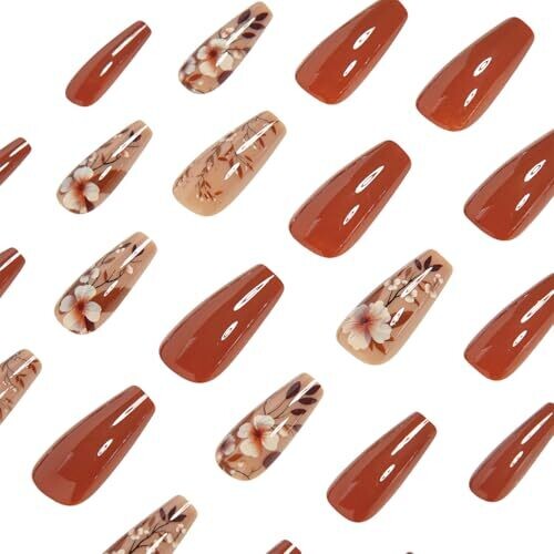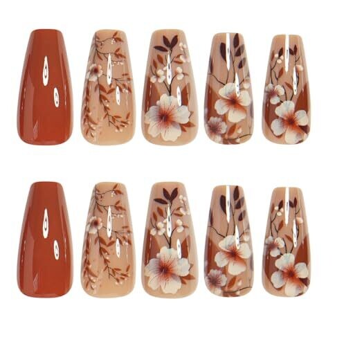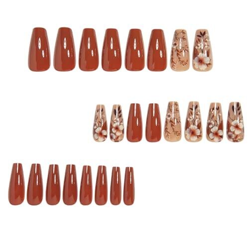 Chic autumn/winter brown palette enhances any outfit. Medium-length coffin nails offer a dramatic, sophisticated look for daily wear or special occasions. Embossed cross and heart details add elegance. Reusable press-on nails deliver salon-quality results at home with 24 pieces.