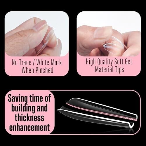 • Crafted from premium soft gel, ultra-transparent and free from marks after bending; compatible with polish, dip powder, and acrylic powder; soak-off removal with no over-filing.