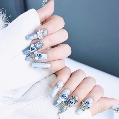 • Yazikisa Press On Nails Handmade Long Coffin Nails with Charms (Blue) 10pcs (M)