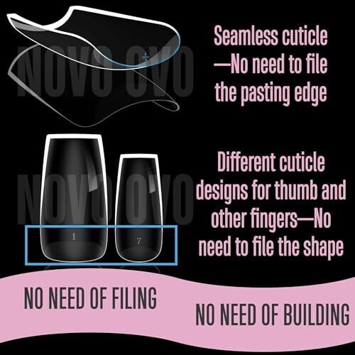 No filing required for cuticle preparation; pre-filed cuticle end; round square shape for the thumbs and a rounded design for the other nails; sides do not require shaping.