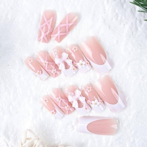 • Get salon-quality French tip perfection at home with a chic press-on solution featuring bow charm accents.