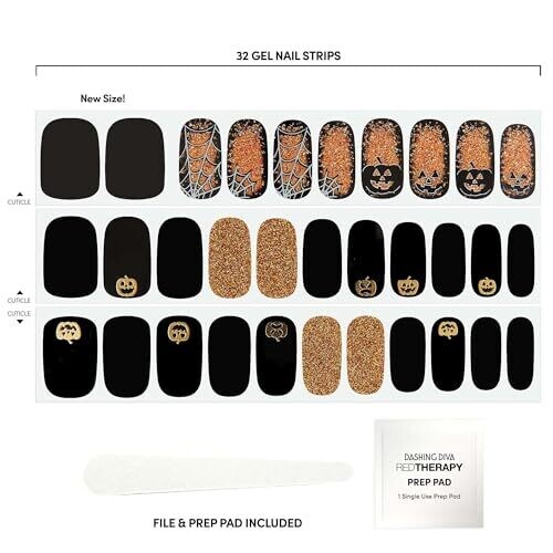 • The Twisted Nightmare design features black gel strips with orange glitter, spiderwebs, and gold pumpkin accents for Halloween charm.