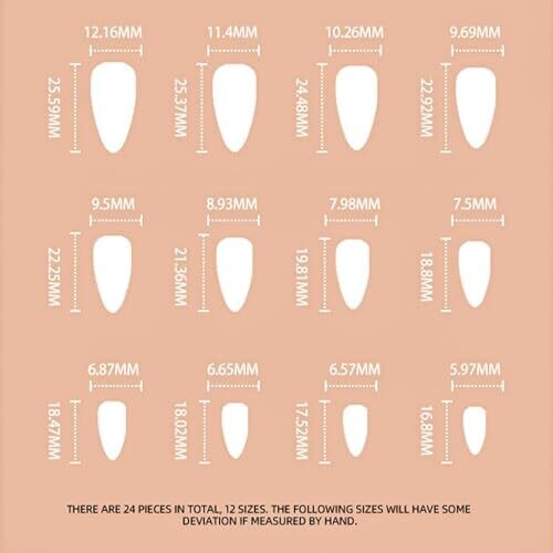 24pcs stick-on nails (12 sizes assorted), 1 x nail file, 1 x wood stick, 1 x jelly glue; Material