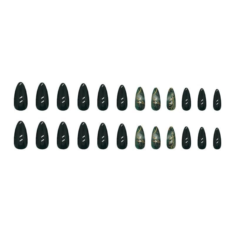 Effortless 24-piece nail kit with dark green ombre and gold foil accents for elegant nail art. Includes 12 sizes, stick-on and removable options, full cover almond tips, and easy steps for reliable, reusable wear. Ideal for weddings and everyday style.