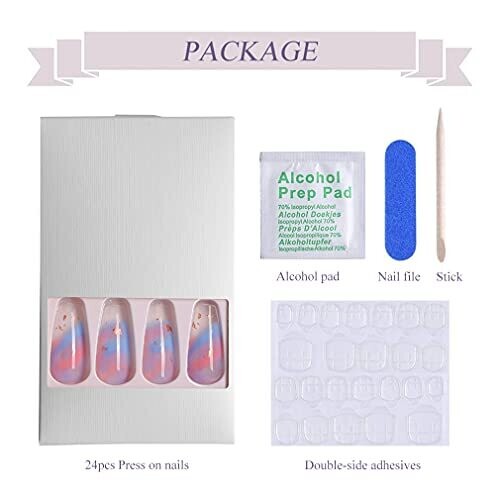 24 pieces in 12 sizes; tips can be trimmed to any length or shape. Made of ABS material; non-toxic and odor-free; safe for nails and body. Ombre design with long coffin shape and glossy finish. Applies with double-sided adhesive; press for about 5 minutes. Wear lasts several days with normal care; use glue to extend wear. Suitable for professional use or at-home nail art; appropriate for various occasions.