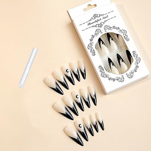 Misud long stiletto press‑on nails with a glossy finish create a bold goth look featuring a moon design. Includes 24 nails in 12 sizes and nail glue for easy at‑home application and durable, ready‑to‑wear convenience.