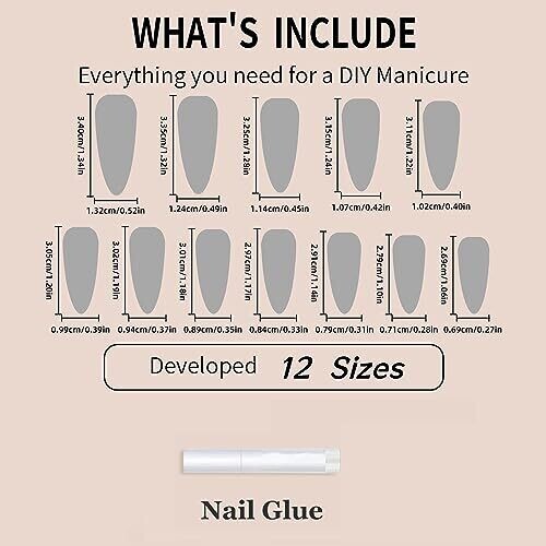 • Includes 24 nails in 12 different sizes plus nail glue for a complete at‑home set.
