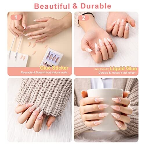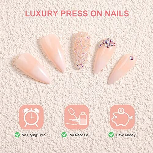 24pcs designed press on nails (8 pcs with rhinestones). We have strengthened the glue for crystals so that these stones will not fall off so easily. In just a few minutes, you can have the same quality as a nail salon. Try it, these beautiful fake nails will not disappoint you.