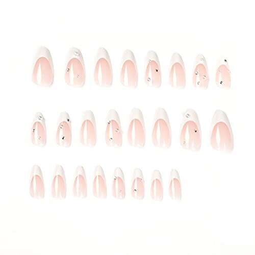 24-piece white French tip press-on nails with rhinestones provide a glamorous, glossy look. Short length suits everyday wear. Easy at-home application with durable ABS material and multiple sizes for a comfortable, customizable fit. Great gift for women and girls.