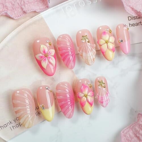 Ghqhsq French Tip Press On Nails - 3D Hibiscus Acrylic Nails with Starfish