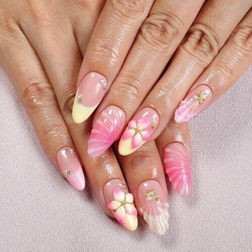 Ghqhsq French tip press on nails set includes 24 medium almond press-ons with jelly glue. Features 3D hibiscus flower and gold shell starfish accents for a glossy, long-lasting summer manicure you can apply at home in minutes.