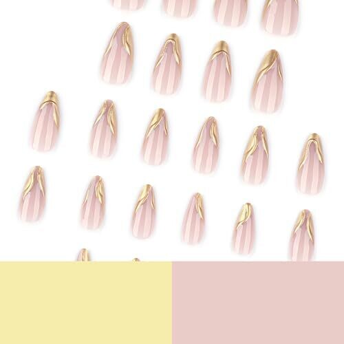 KaleidNail Nude Almond press-on nails come in 24 pieces with a glossy gold finish for a daily glamorous look. Medium length, full-cover nails for natural wear, quick at-home application, and a secure, long-lasting fit.