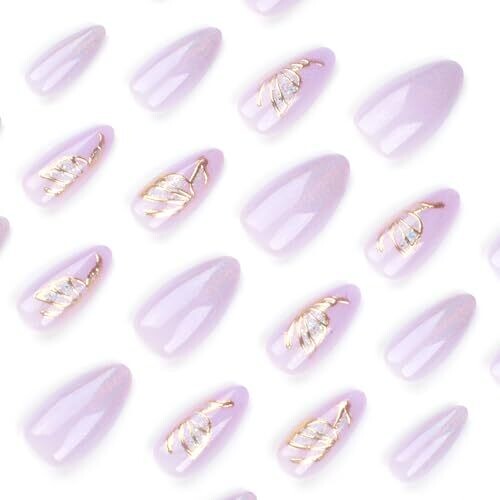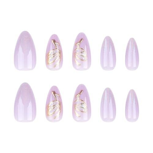 Kaleidnail nude almond press on nails in 24-piece set. Glossy purple glitter finish for full cover, medium length. Easy stick-on application, lightweight, durable, safe for daily decoration for women and girls.