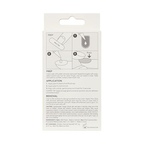 • Complete kit with 28 press-on nails, 2 g pink gel glue, a mini file, and a manicure stick.