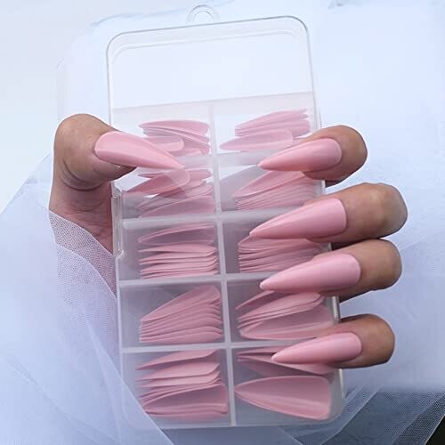 100 pieces total, long stiletto full-cover nail tips in glossy finish. Comes in 10 sizes (numbers #2, #3, #4, #4.5, #5, #5.5, #6, #7, #8, #9) with 10 pieces per size. Made from ABS material, non-toxic, odorless, and skin-friendly. Reusable and can be trimmed to desired length using standard nail clippers and files. Glue or jelly glue is not included. Suitable for home use and professional nail salons; can be customized with paint, glitter, rhinestones, and other nail art techniques.